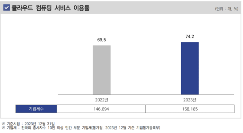 기업의 클라우드 컴퓨팅 서비스 이용률(15만8165개 기업 대상 조사)은 74.2%을 기록