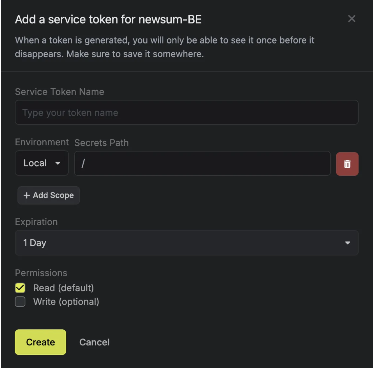 이름, 환경 설정하고 Secret Path는 그대로 놔두셔도 됩니다. 아마 프로젝트에 폴더를 만드셨으면 그 경로로 해야할 겁니다. 그리고 만료일을 설정하고 만들면 Token이 발급되는데 이건 한번만 보이니 안전한 곳에 잘 저장해두고 두고두고 쓸겁니다.
