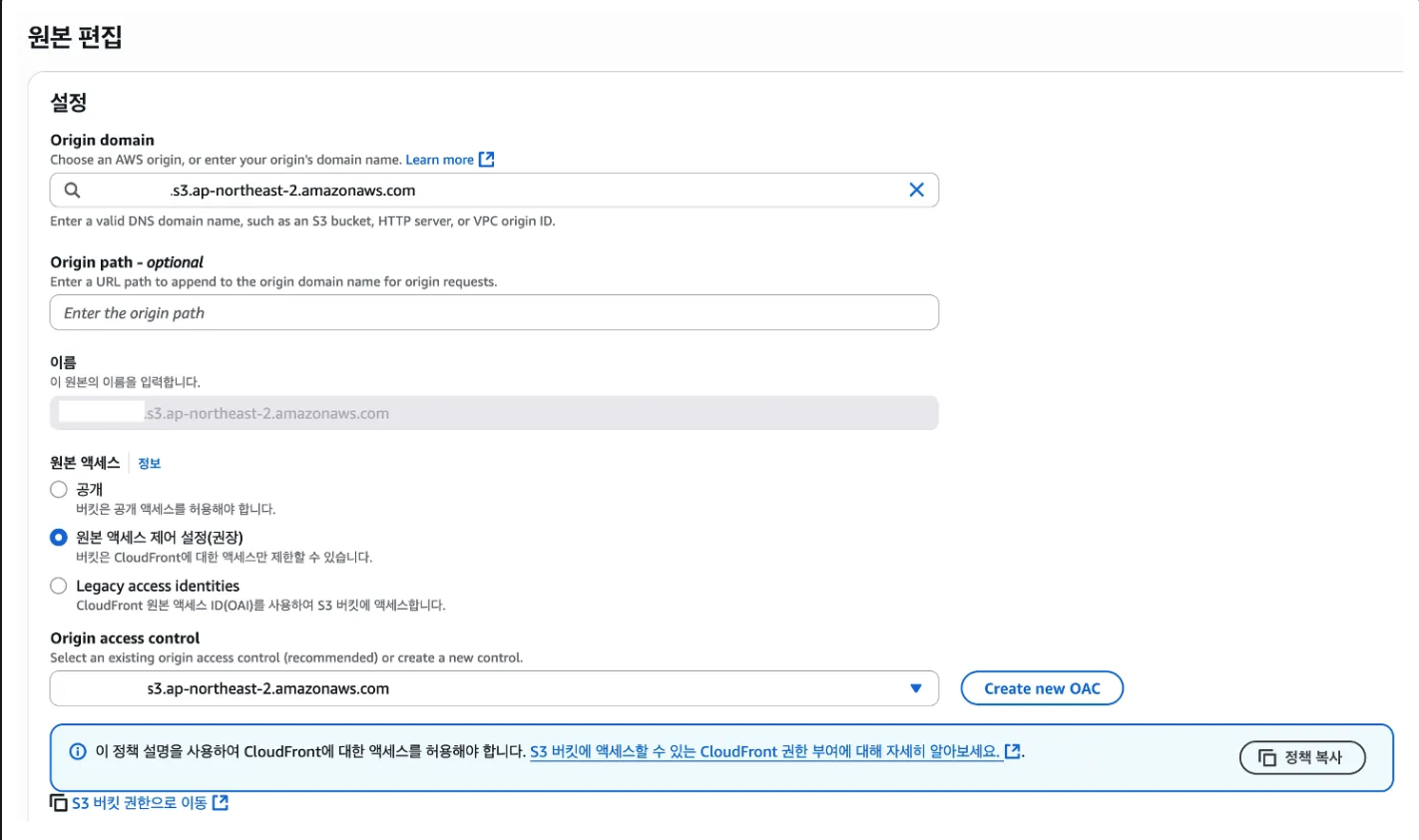 { "Version": "2012-10-17", "Statement": [ { "Sid": "AllowCloudFrontOACReadOnly", "Effect": "Allow", "Principal": { "Service": "cloudfront.amazonaws.com" }, "Action": "s3:GetObject", "Resource": [ "arn:aws:s3:::{버킷이름}/*", ], "Condition": { "StringEquals": { "AWS:SourceArn": "{CLOUDFRONT 배포주소}" } } } ] }CloudFront 배포 - 원본의 원본 생성을 눌러 다음 그림과 같이 설정합니다.
