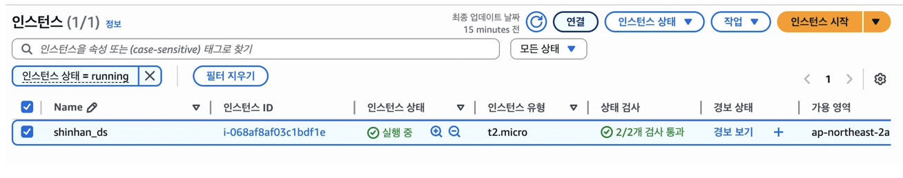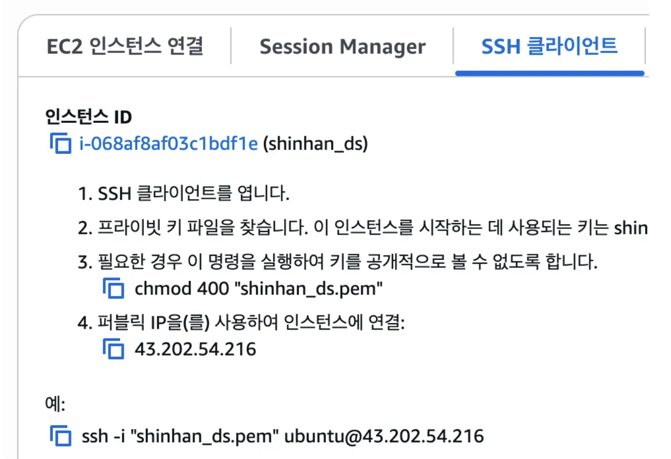 ssh -i "shinhan_ds.pem" ubuntu@43.202.54.216인스턴스는 삭제할거기때문에 IP를 따로 블러처리하지 않았습니다.