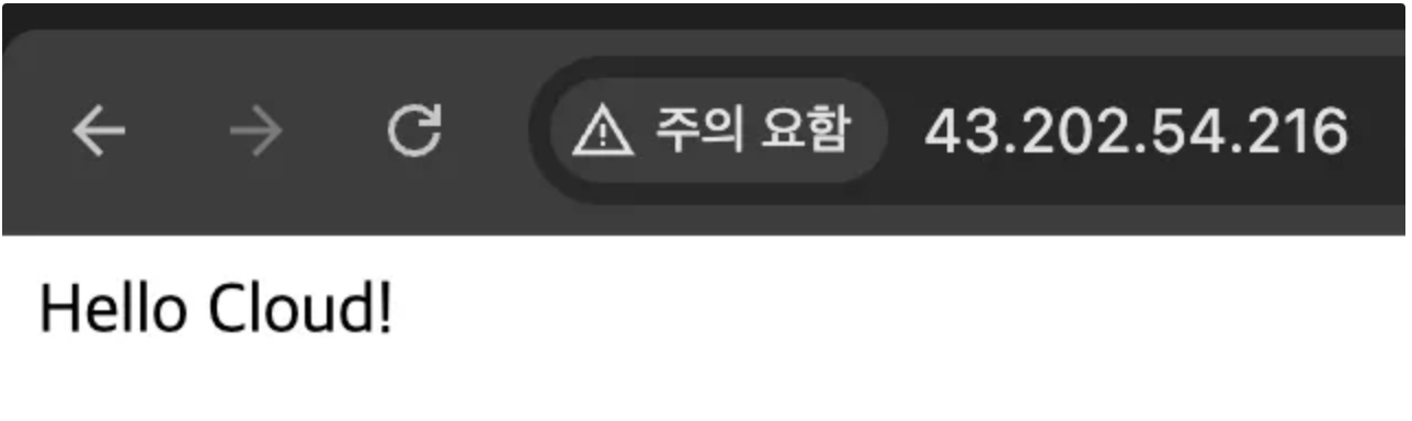 <!DOCTYPE html> <html> <head> <title>Welcome to nginx!</title> <style> html { color-scheme: light dark; } body { width: 35em; margin: 0 auto; font-family: Tahoma, Verdana, Arial, sans-serif; } </style> </head> <body> <h1>Welcome to nginx!</h1> <p>If you see this page, the nginx web server is successfully installed and working. Further configuration is required.</p> <p>For online documentation and support please refer to <a href="http://nginx.org/">nginx.org</a>.<br/> Commercial support is available at <a href="http://nginx.com/">nginx.com</a>.</p> <p><em>Thank you for using nginx.</em></p> </body> </html>이런 기본 index.html 파일이 나올텐데 vi 명령어로 들어간 이후에 dG로 이것을 다 지우고 i를 눌러서 Hello Cloud!를 입력하고 wq로 저장하고 나옵니다.