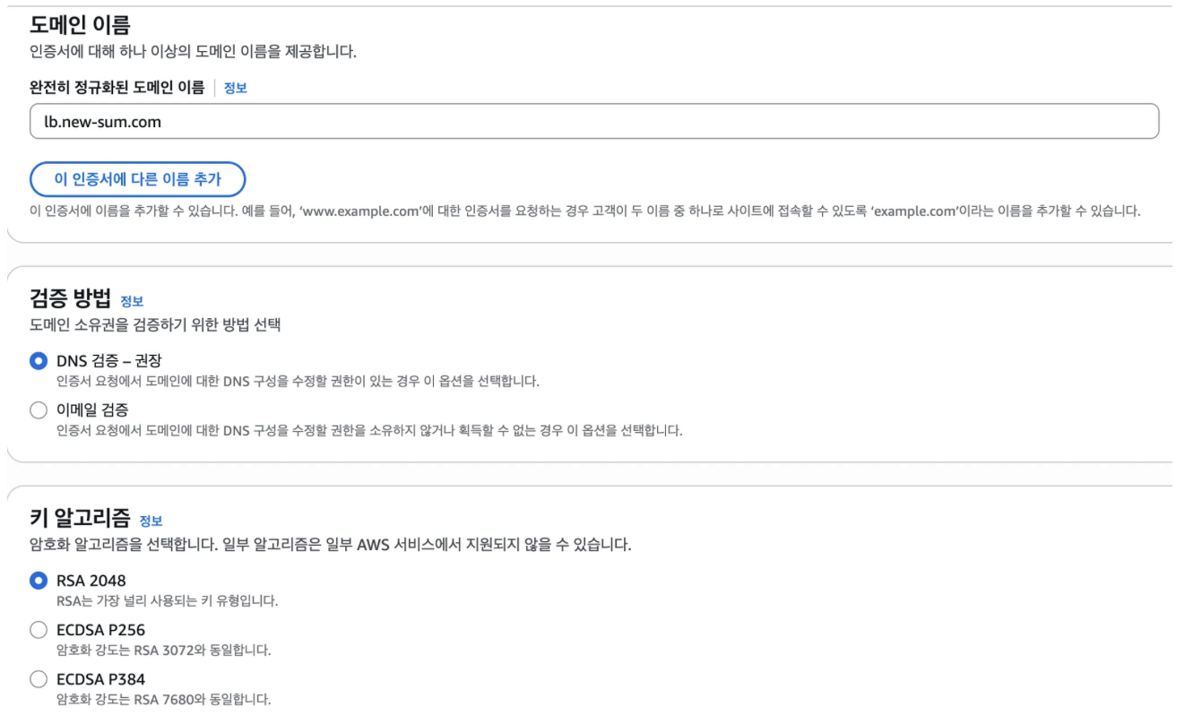 그리고 ACM에 들어가서 lb.mycertione.com으로 인증서를 요청합니다.