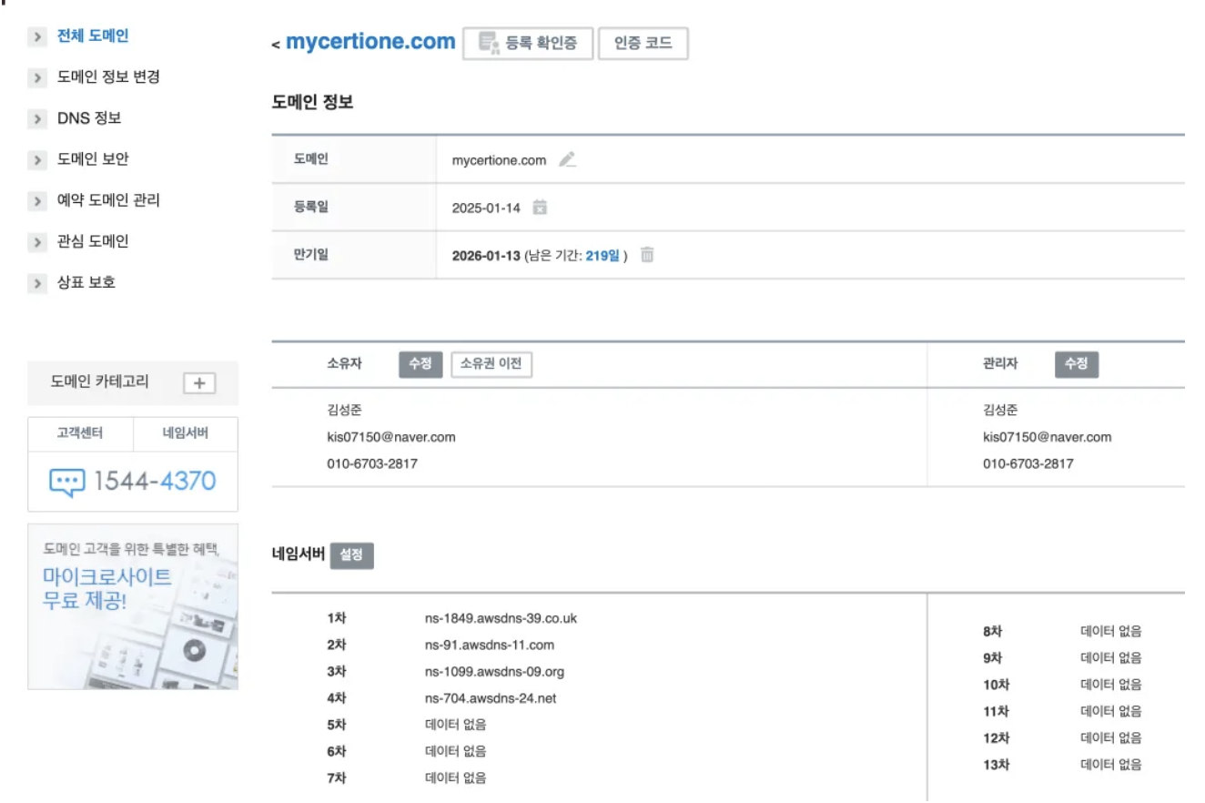 가비아의 도메인 관리에 들어가서 네임서버에 Route53 호스팅 영역 생성하고 나온 것들을 넣어줍니다.