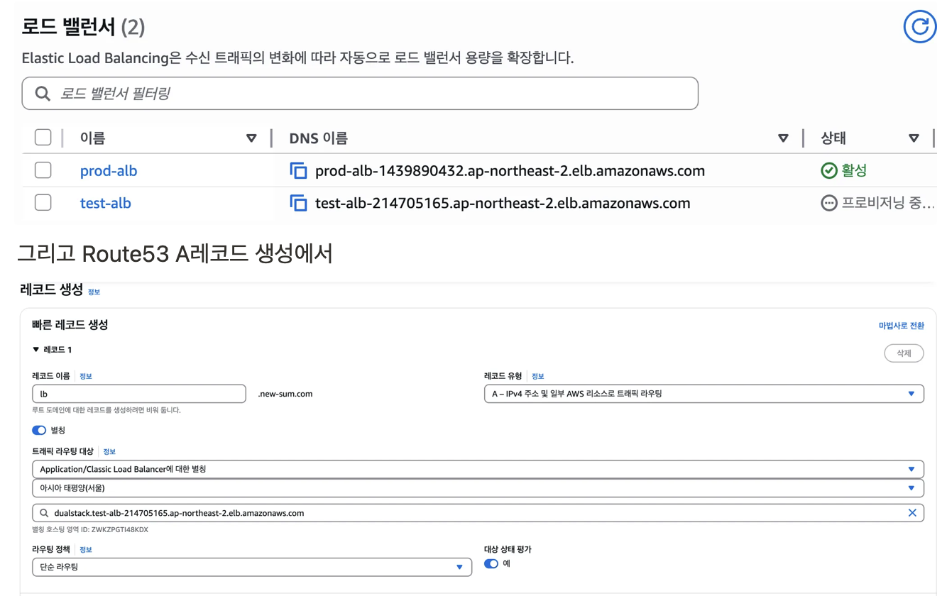 제 생각에 생성한 인증서를 alb에 달 것으로 예상하기 때문에 서브도메인을 lb를 붙여 A레코드를 생성하도록 하겠습니다.