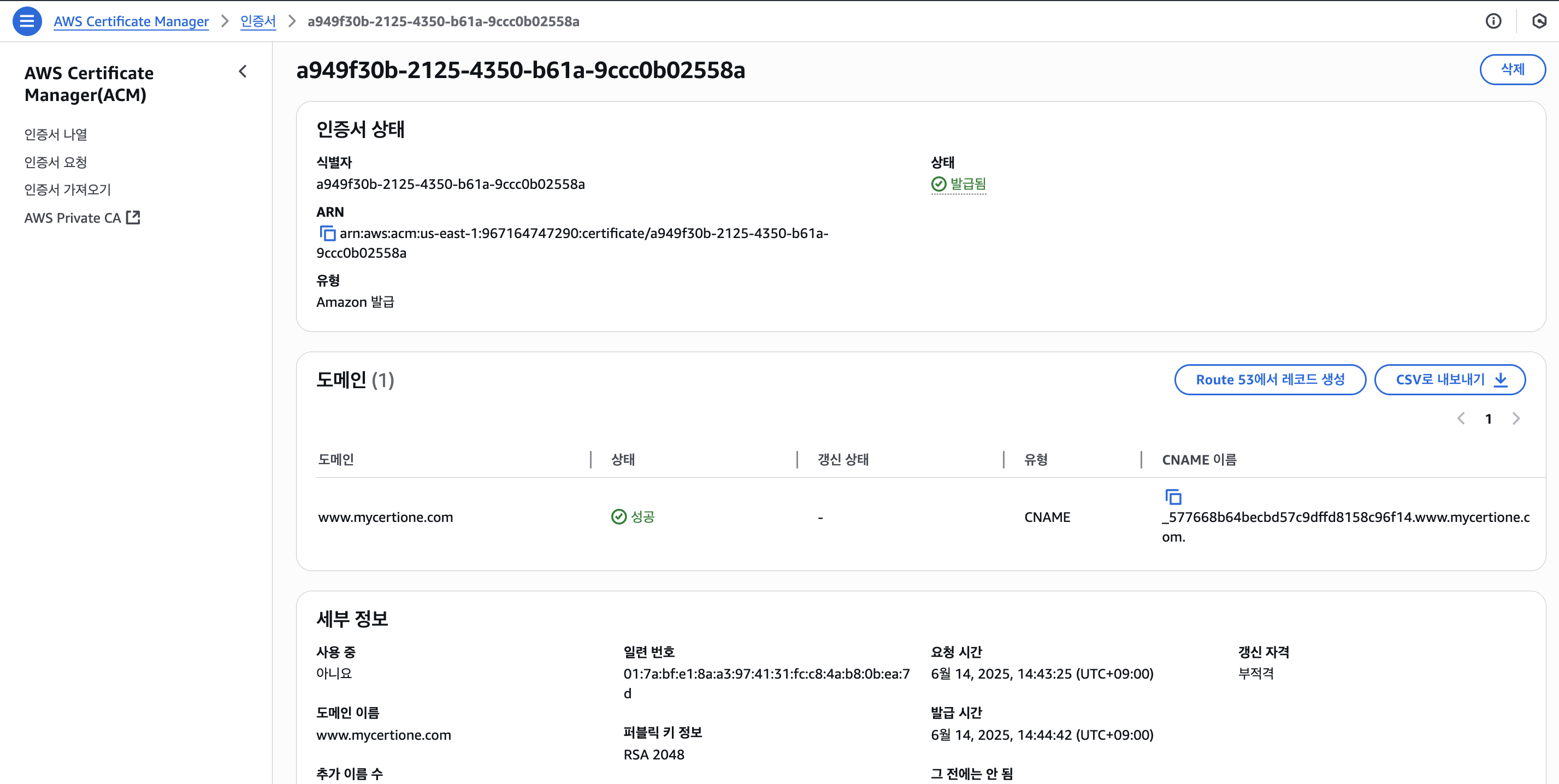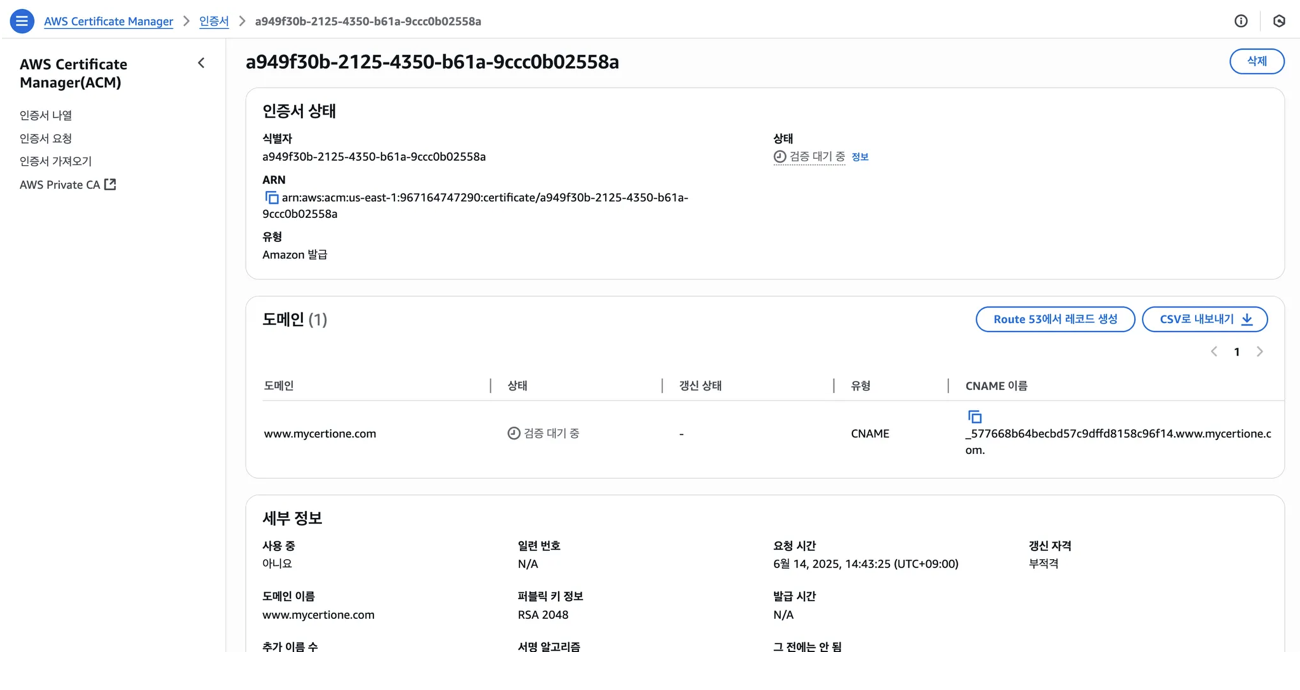 - 등록 후 ACM으로 버지니아 북부에서 인증서 요청