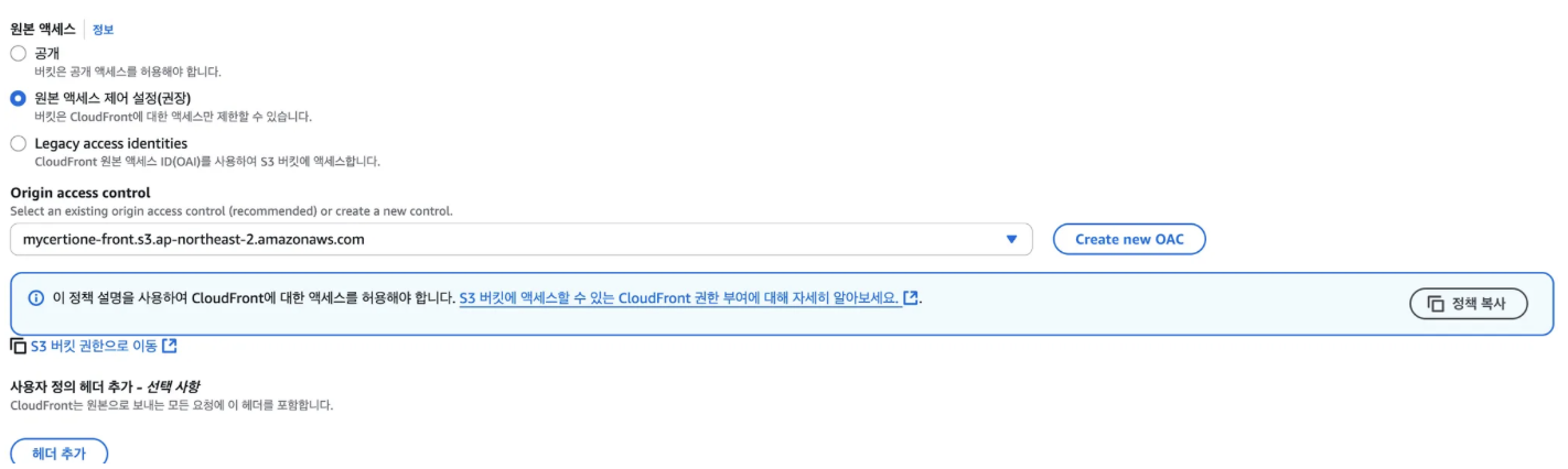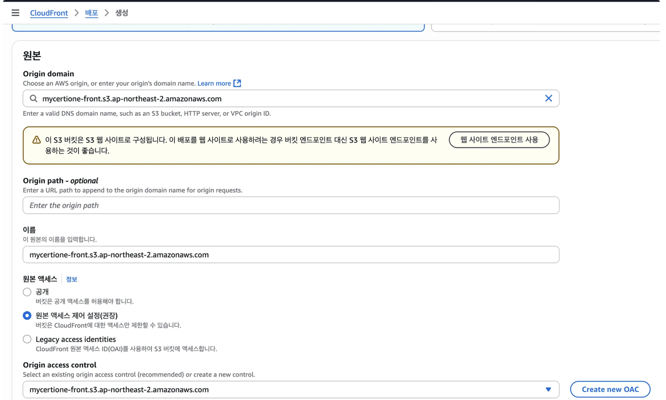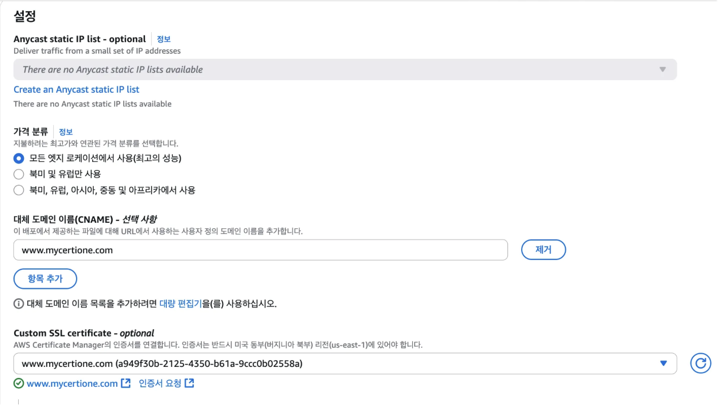 여기서 대체 도메인 이름을 생성하지 않으면 5단계에서 CloudFront 배포가 뜨지 않는 문제가 있었습니다.