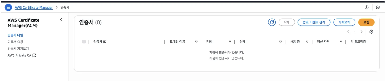 그리고 콘솔에서 “Certificate” 를 입력하면 AWS Certificate Manager가 나옵니다 여기에서 요청을 클릭합니다.