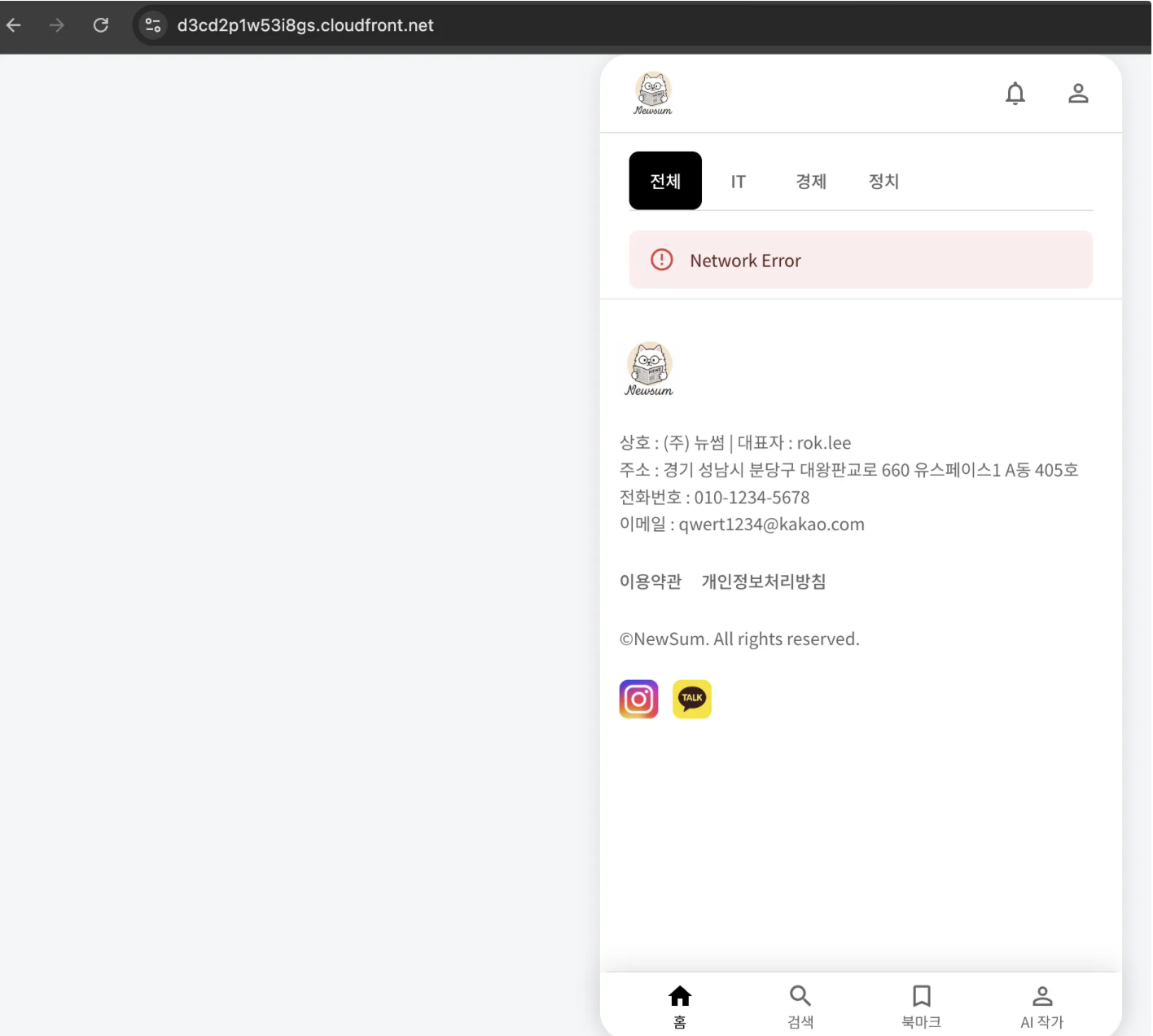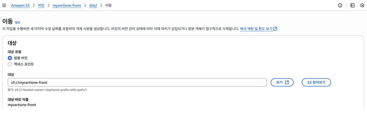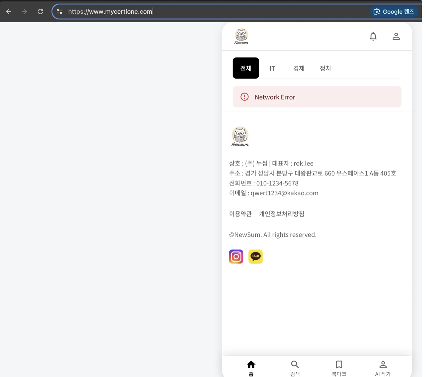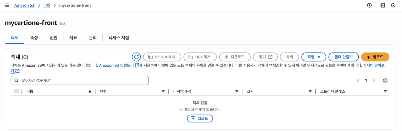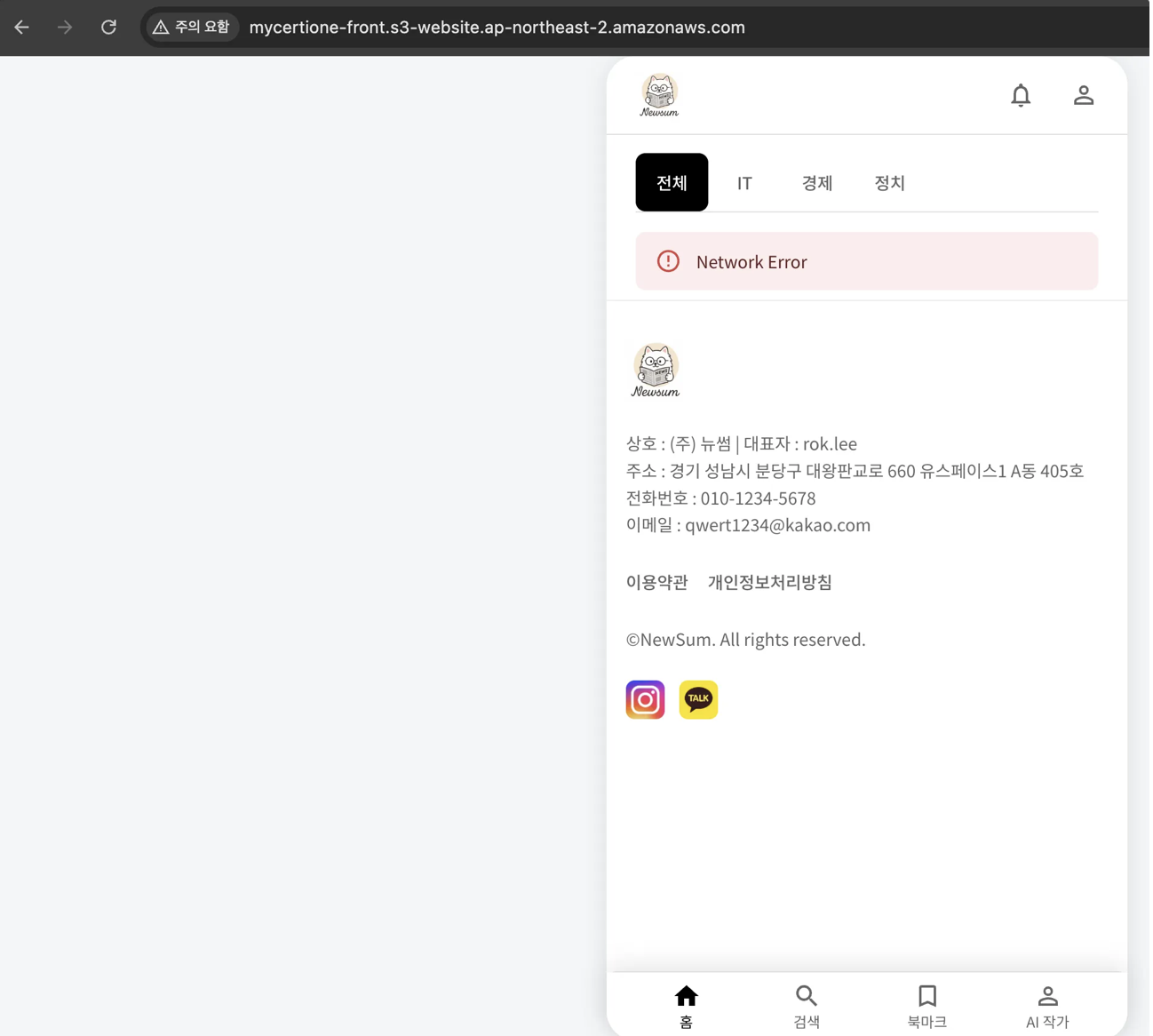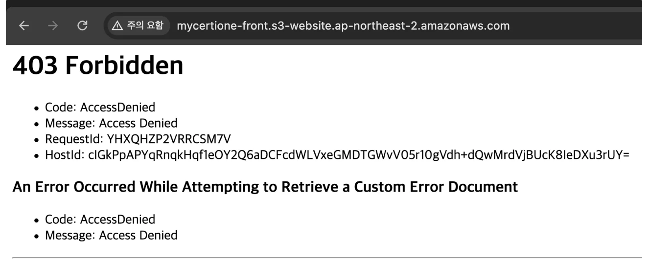 { "Version": "2012-10-17", "Statement": [ { "Sid": "PublicReadForStaticWebsite", "Effect": "Allow", "Principal": "*", "Action": "s3:GetObject", "Resource": "arn:aws:s3:::mycertione-front/*" } ] }그리고 브라우저에 S3 엔드포인트를 입력해주면 화면이 잘 나옵니다. 물론 백엔드가 연결이 되지 않아 네트워크 에러가 뜨긴 하지만 프론트엔드 배포는 잘 되었습니다.