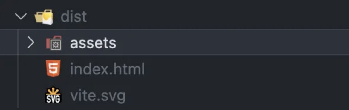 npm run build그리면 dist 디렉토리 내부에 다음과 같은 파일들이 생깁니다. CRA React일 경우 build 파일이 생길 것입니다.