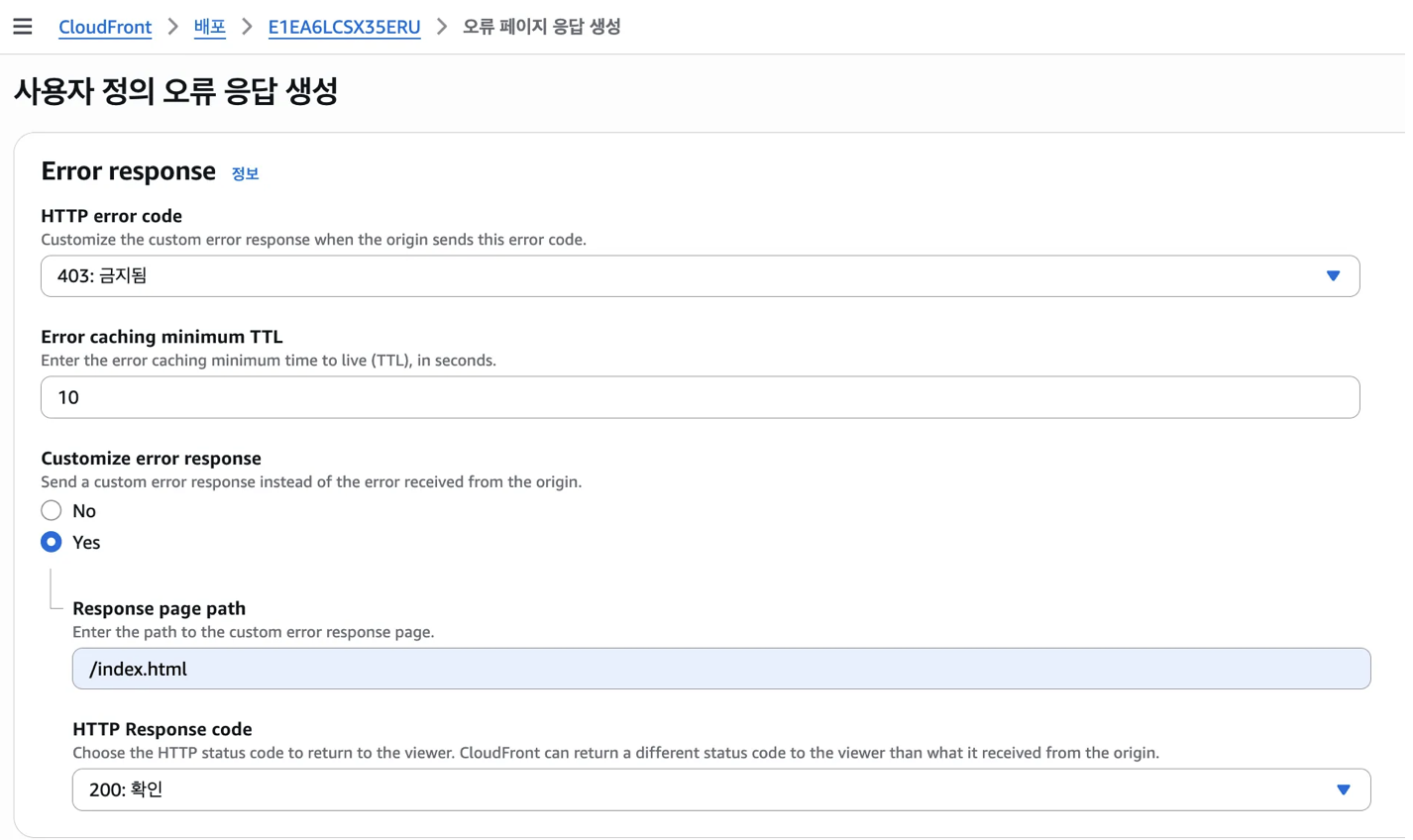 그리고 마지막으로 배포 - 오류 페이지에 접속하여 사용자 정의 오류 응답을 생성해줍니다.