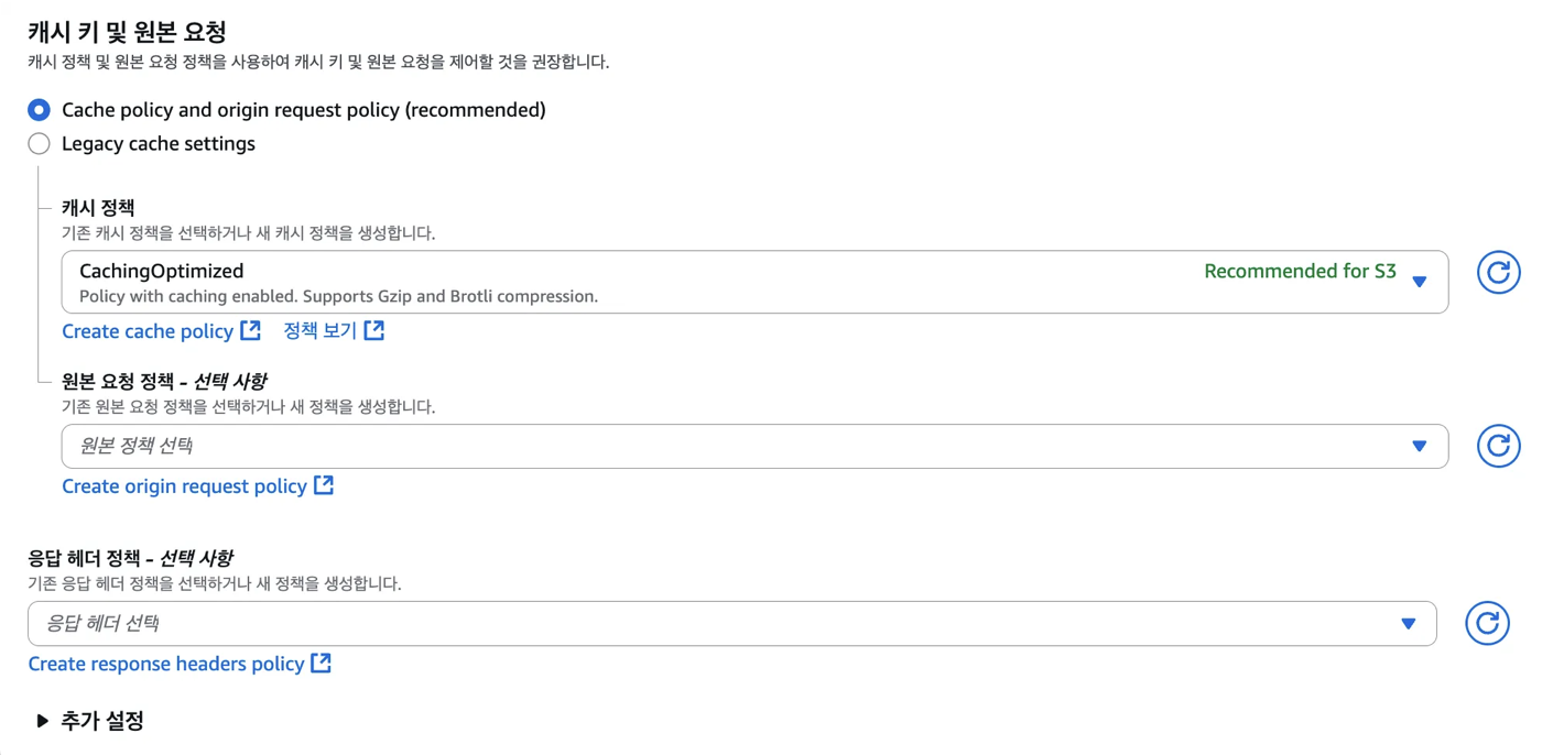 캐시 키 및 원본 요청은 기본 값으로 둡니다.