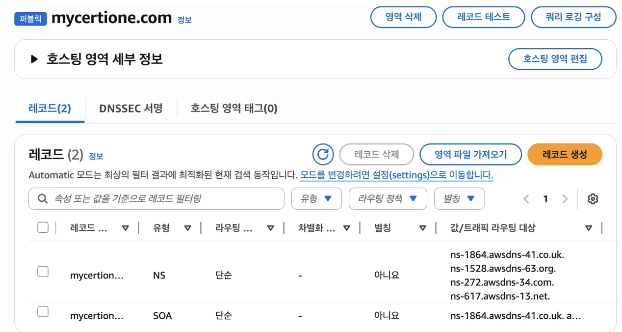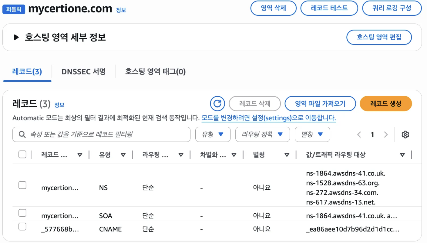 아까 있었던 NS, SOA 제외 CNAME이 하나 더 생겼는데 이건 ACM 인증서에서 DNS 검증에 CNAME을 사용했기 때문입니다.