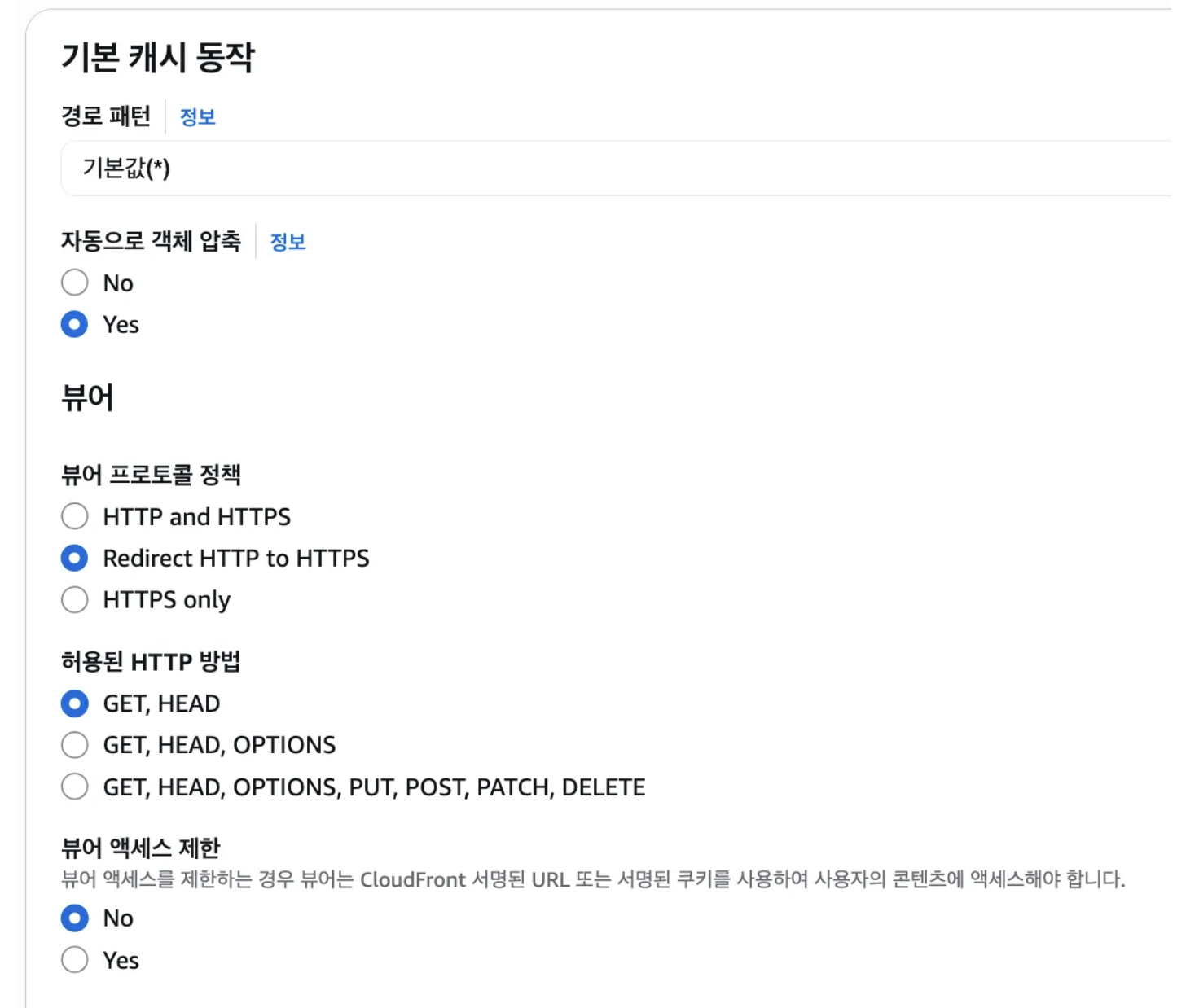 그리고 뷰어 프로토콜 정책 - Redirect HTTP to HTTPS 로 설정합니다.