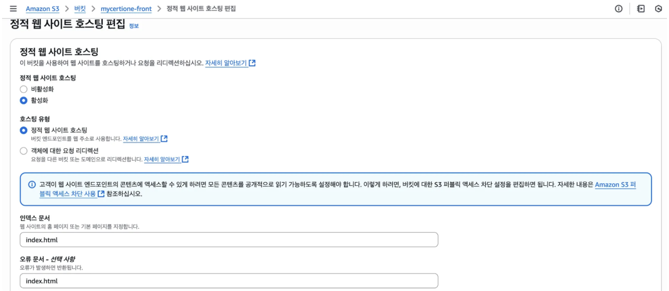 - S3로 프론트엔드 빌드 파일 정적 웹호스팅을 통해 배포