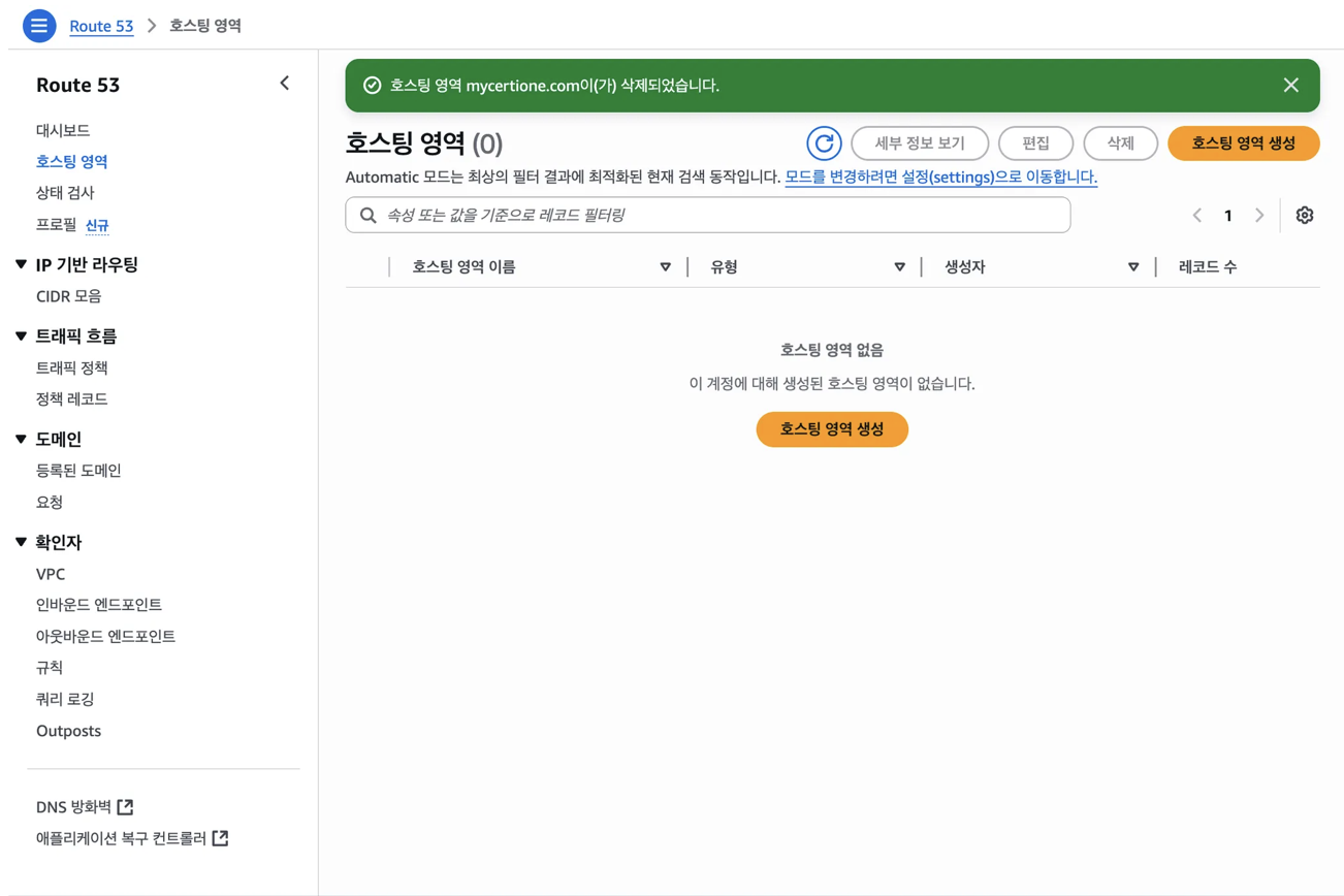 그걸 하기 위해 콘솔에서 Route53 - 호스팅 영역 으로 이동합니다.