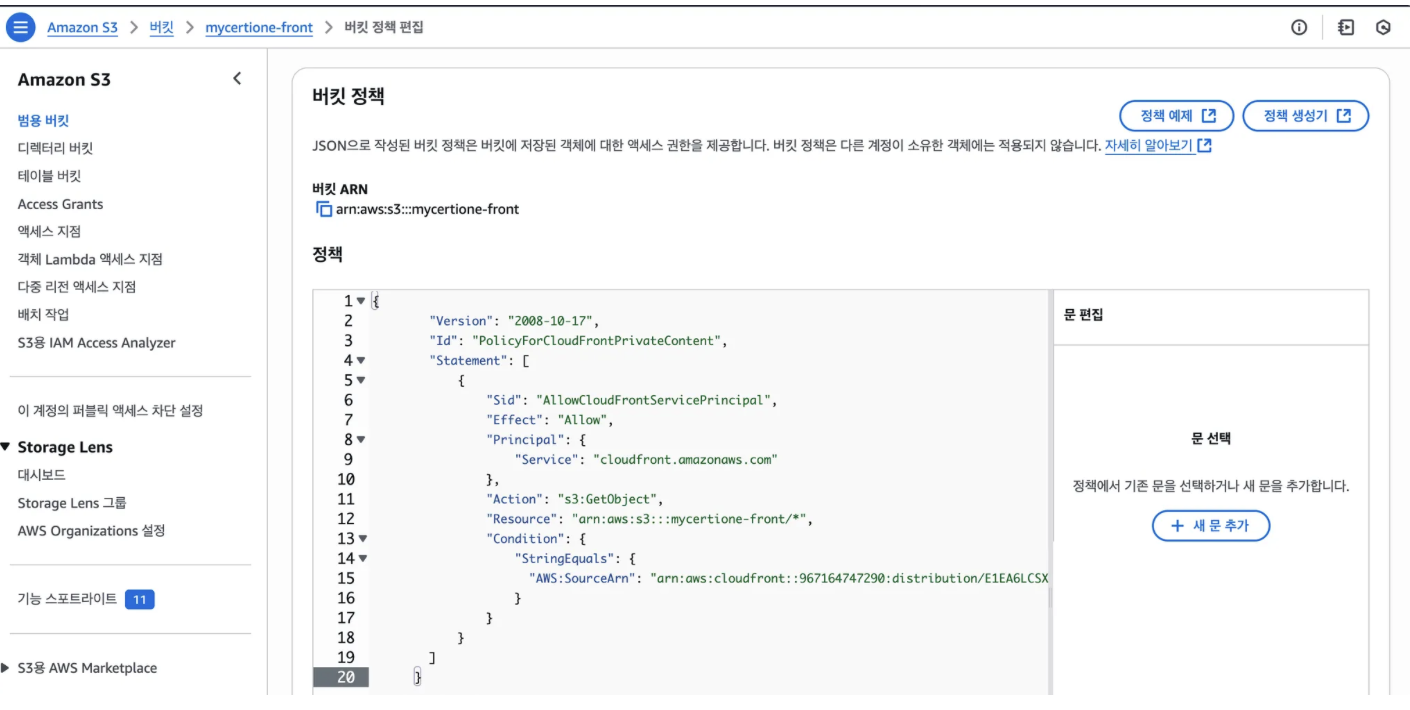 버킷 정책은 S3버킷 - 권한 탭에 있습니다.