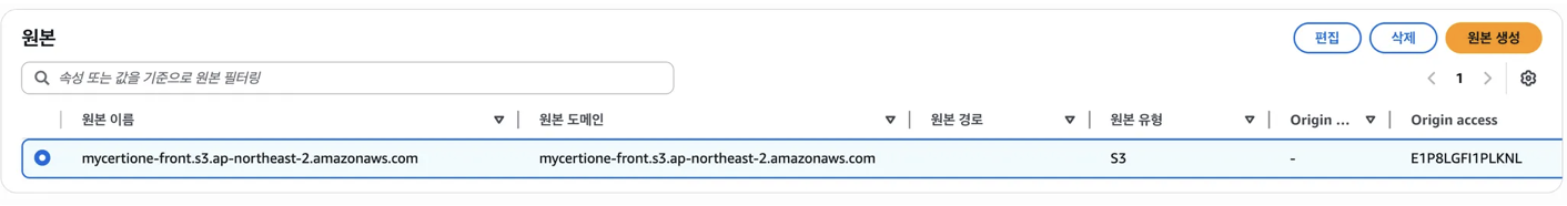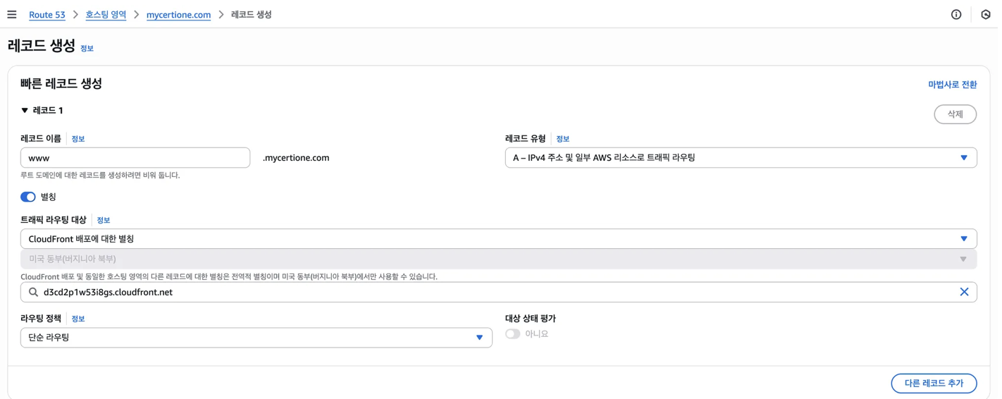 아까 CloudFront 설정할 때 대체 도메인에 www.mycertione.com 으로 설정해주어 배포 선택이 됩니다.