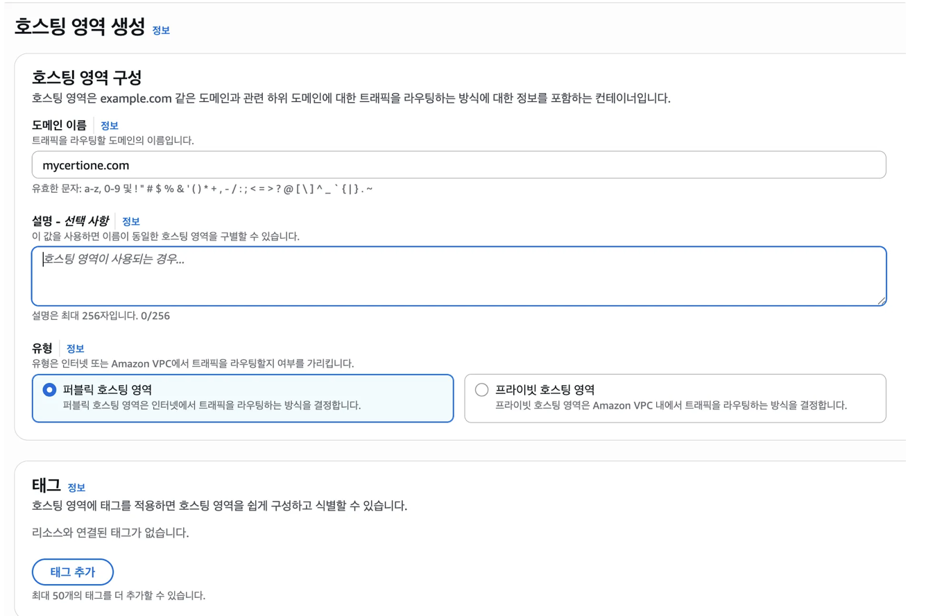 그냥 도메인 이름만 입력하고 호스팅 영역을 생성합니다.