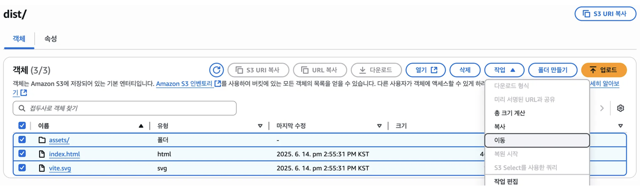 아까 생성했던 폴더 추가해서 dist 폴더를 업로드 합니다.