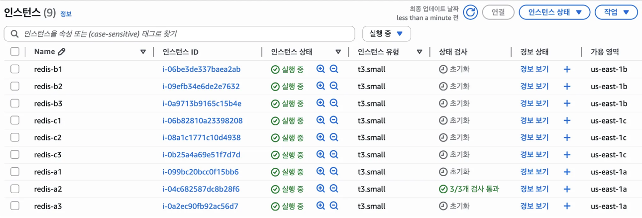 시작템플릿으로 3개씩 3번 생성하여 a,b,c 가용영역에 redis를 넣었습니다. 우선 primary인스턴스를 1번 노드로 하겠습니다.
