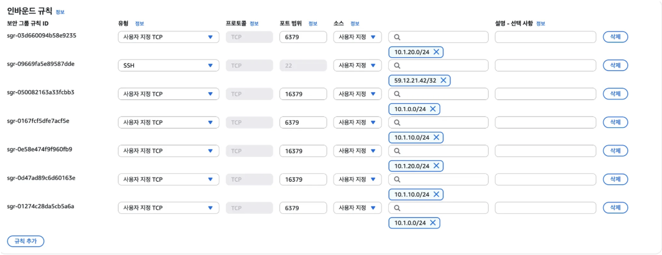 이 세가지 대역에서 오는 요청의 6379포트와 16379 요청을 허용해줍니다.