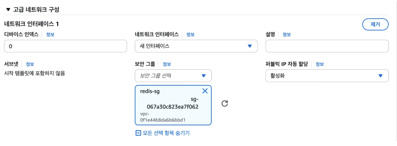 그리고 키페어도 설정해주고 네트워크 설정은 서브넷과 가용영역 설정하지 않고 보안그룹은 기존 생성했던 redis-sg를 넣어줍니다.